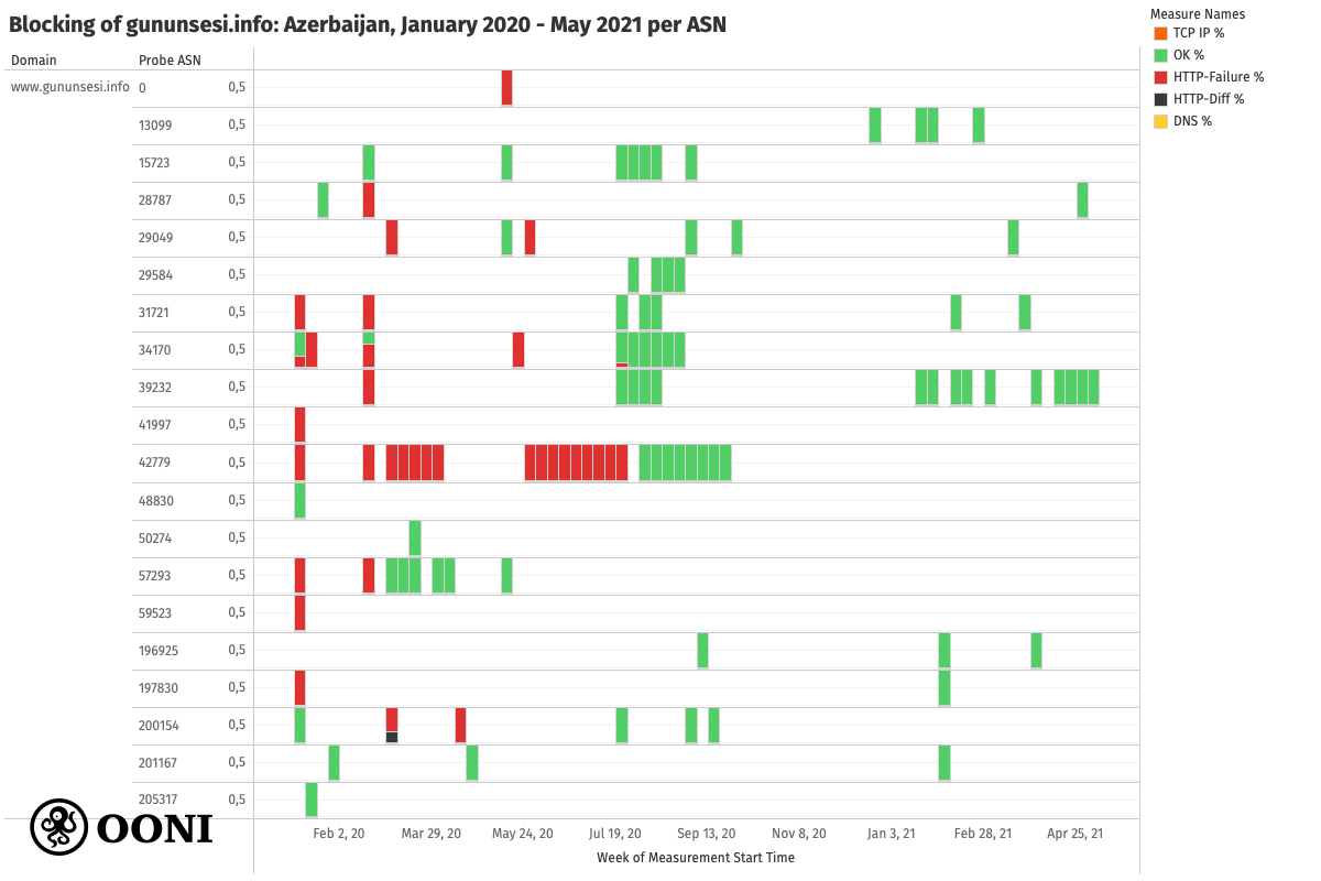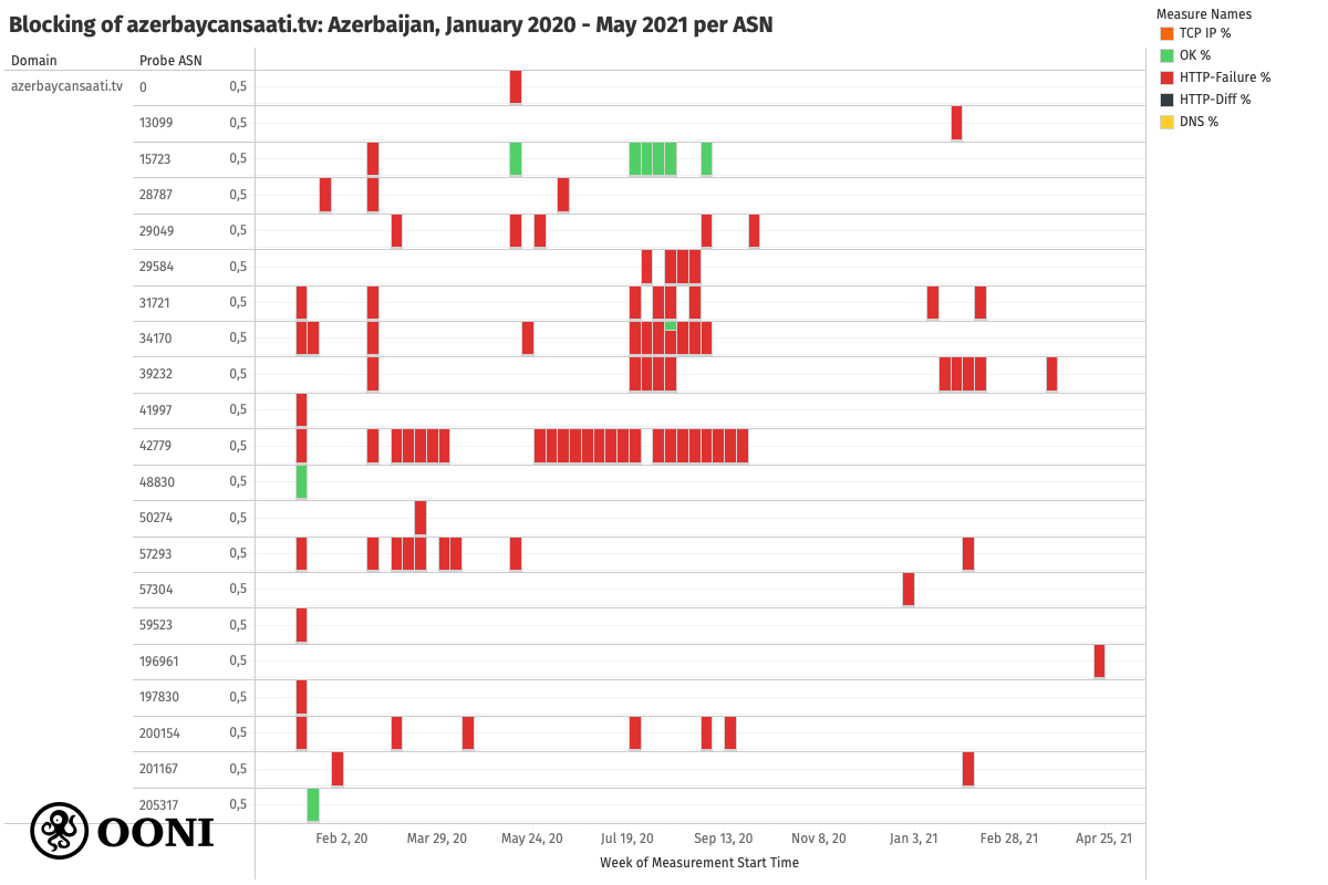 The following chart illustrates OONI measurement findings from the testing of these media websites (on multiple local networks) in Azerbaijan between January 2020 to May 2021.