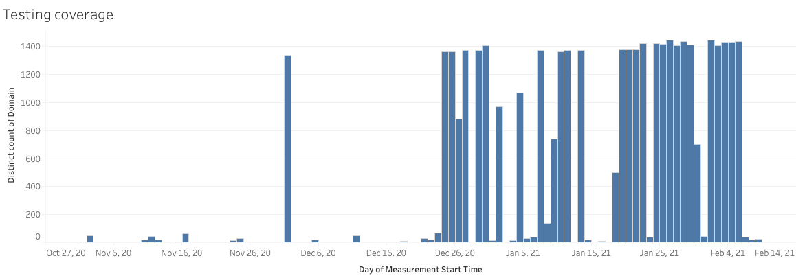 But starting from 24th December 2020, OONI Probe testing coverage in Azerbaijan increased significantly. The following chart illustrates that most domains from the testing lists were tested at least once between December 2020 to February 2021, while in many cases, around 1,400 domains were tested per day in Azerbaijan.