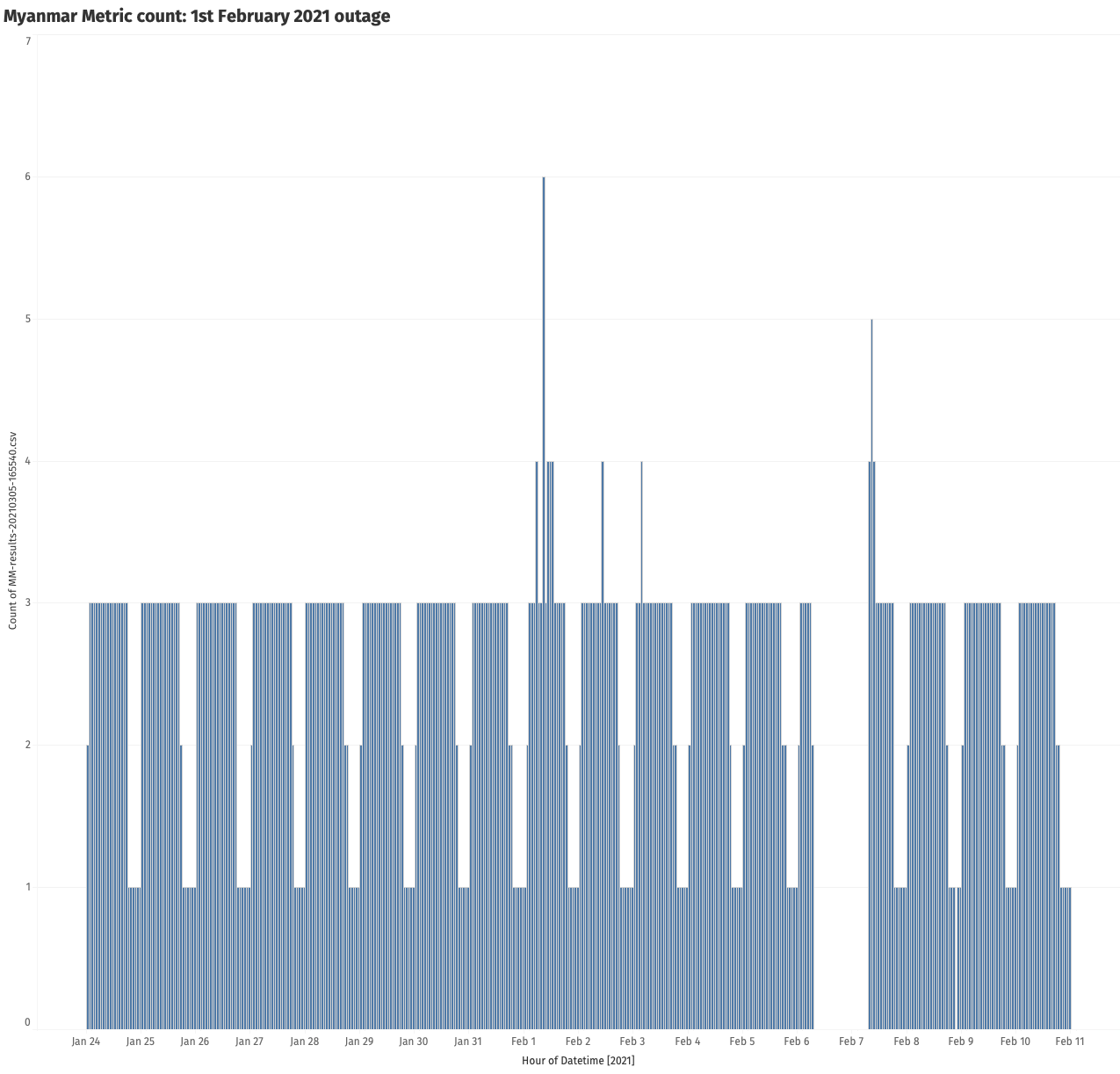 When a second Internet outage occurred in Myanmar a few days later (on 6th February 2021), Mozilla telemetry provided a strong signal as we observe the complete absence of metrics during that period.