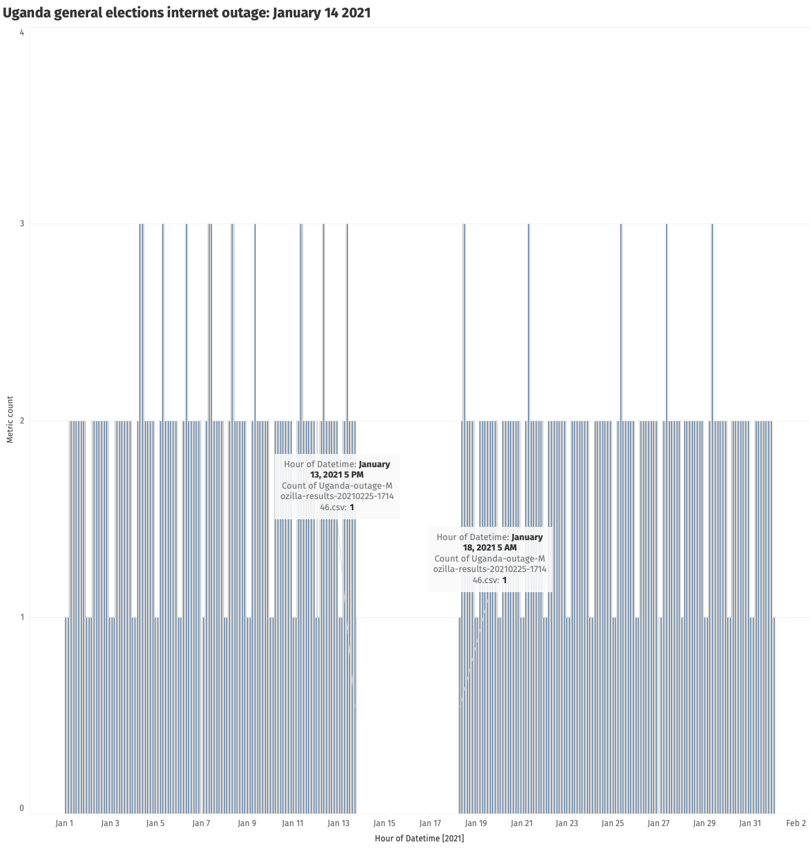 In this case study, we compare Mozilla telemetry with IODA, the (now discontinued) Oracle Internet Intelligence map, Google traffic data, and Cloudflare radar data to explore whether Uganda’s 4-day Internet connectivity shutdown is visible in Mozilla telemetry.
