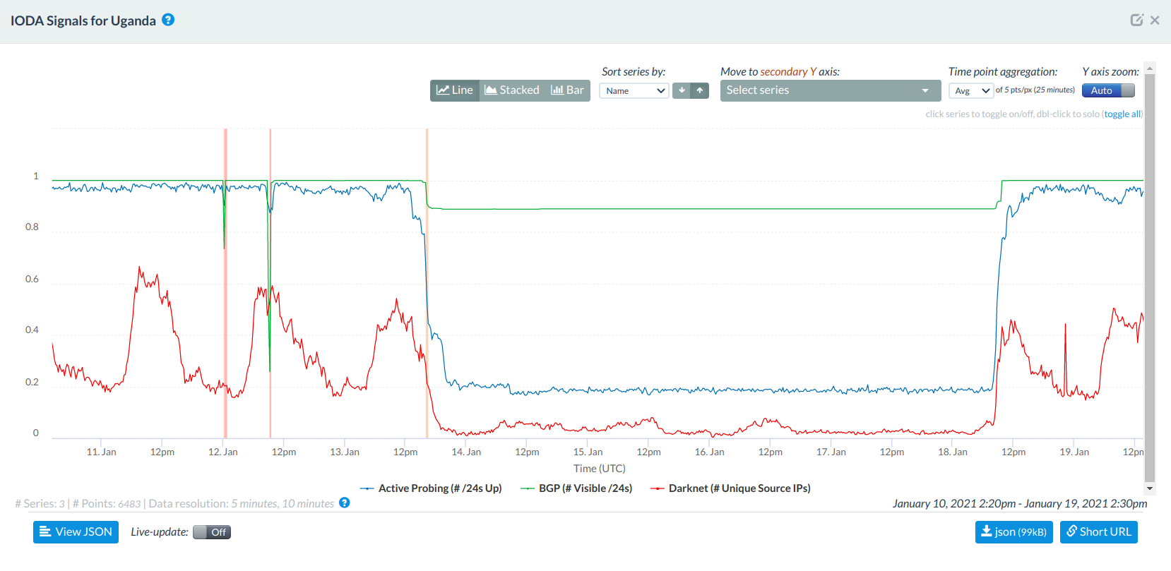 Source: Internet Outage Detection and Analysis (IODA), IODA Signals for Uganda, https://ioda.caida.org/ioda/dashboard#view=inspect&entity=country/UG&lastView=overview&from=1610280000&until=1611057600