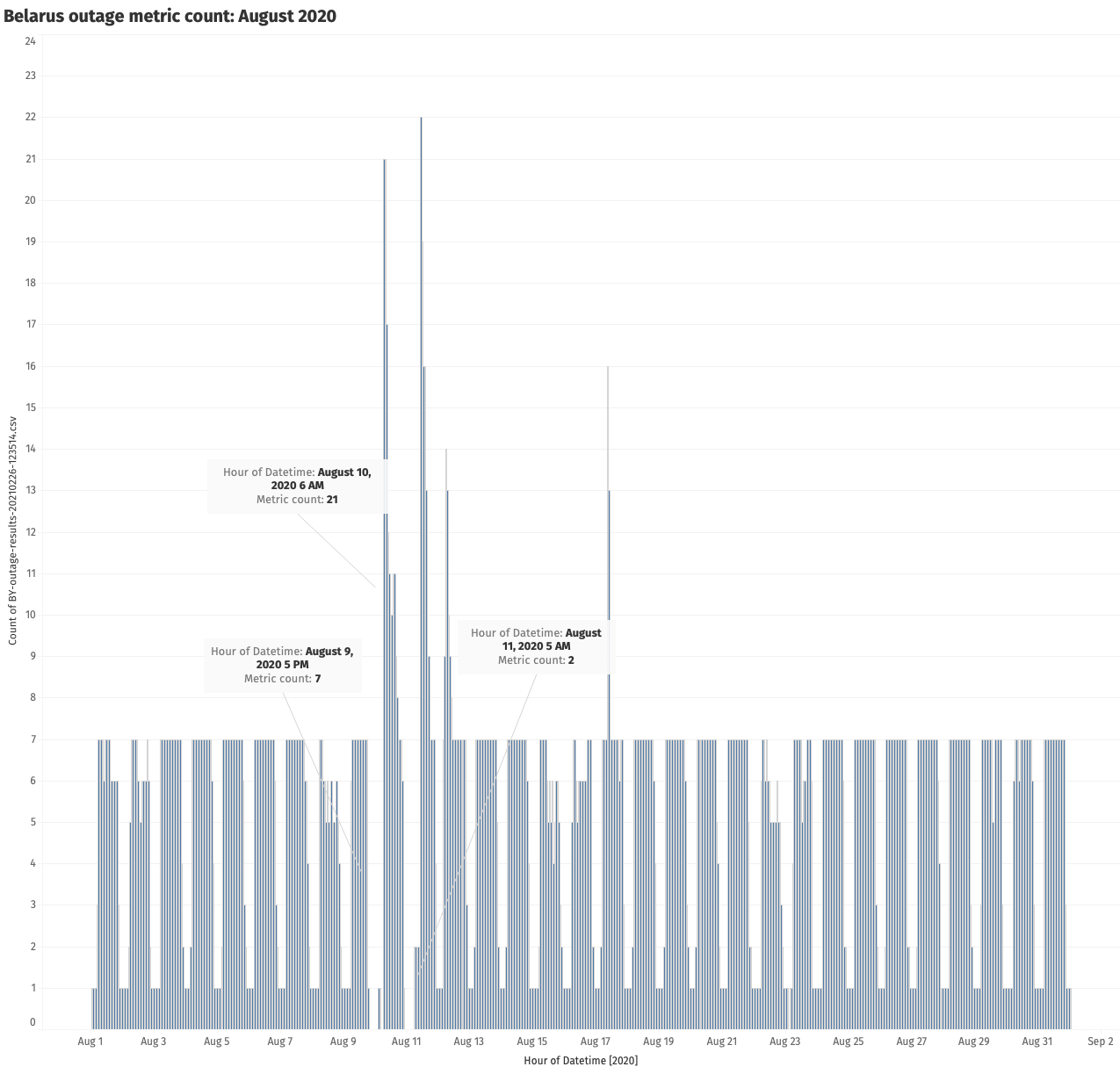 Source: Internet Outage Detection and Analysis (IODA): Belarus (August 2020), https://ioda.caida.org/ioda/dashboard#view=inspect&entity=country/BY&lastView=overview&from=1596114973&until=1598534173
