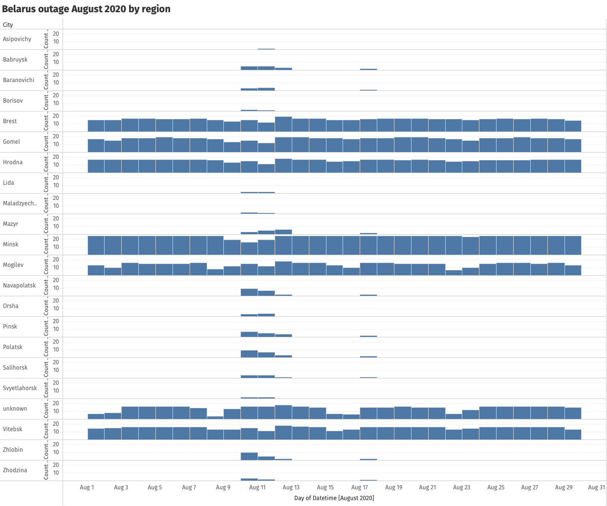 By looking at Mozilla telemetry (above) from Belarus on the evening of 9th August 2020, we can see that the number of locations submitting metrics starts dropping at around 17:00 UTC. This is followed by a complete absence of metrics until 10th August 2020 at 17:00 UTC. Thereafter, we can see that metrics start being submitted again for some hours until 20:00 UTC. After that there is another interruption in metric submission, until traffic appears to fully resume on 11th August 2020 at 05:00 UTC.