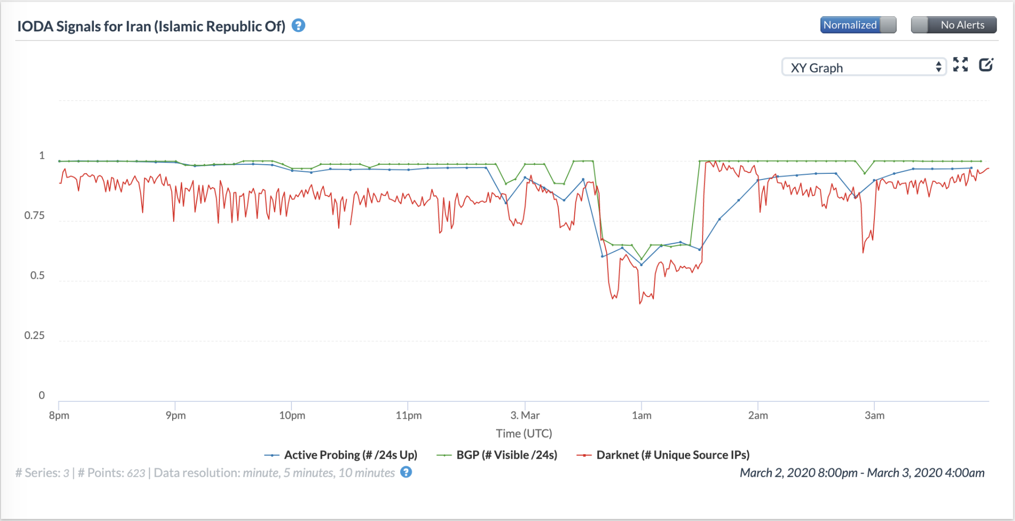 Source: Internet Outage Detection and Analysis (IODA): Iran (March 2020), https://ioda.caida.org/ioda/dashboard#view=inspect&entity=country/IR&lastView=overview&from=1583179200&until=1583208000