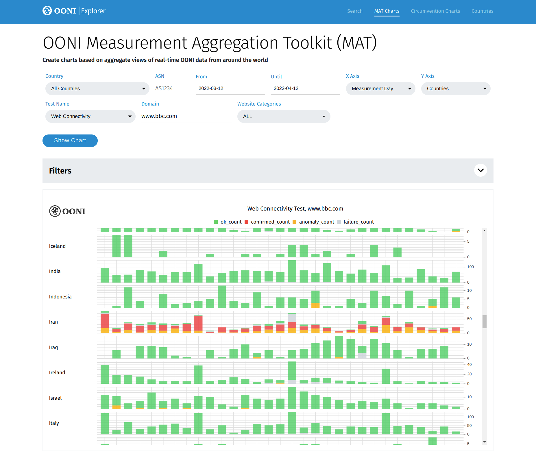 The MAT provides filters that enable you to select the parameters you care about in order to plot charts based on aggregate views of OONI data.