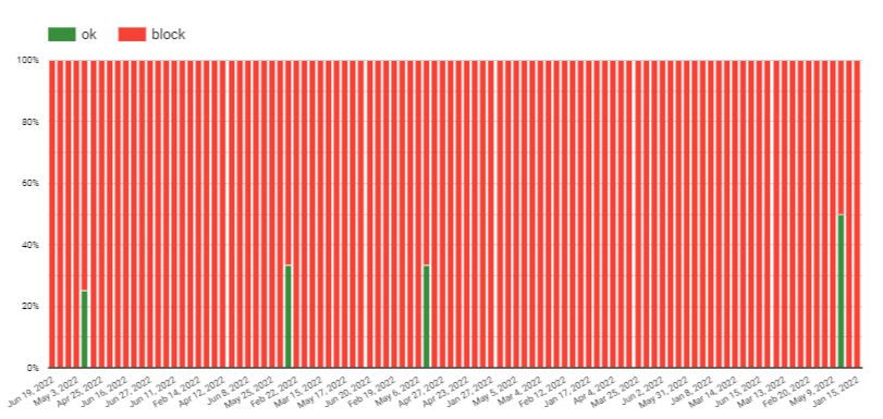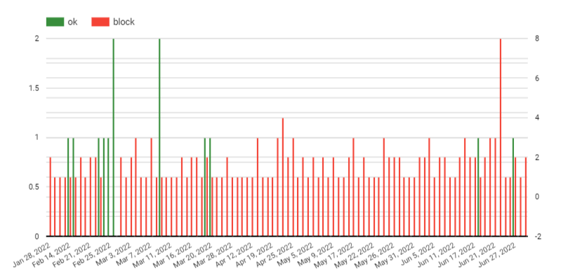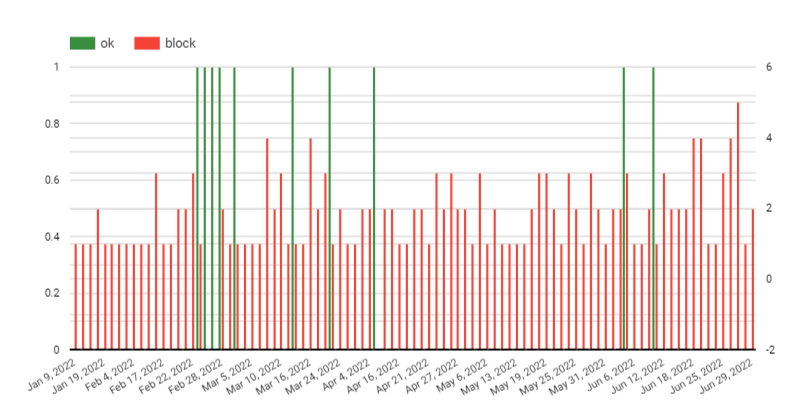 Figure: Percentage of no blocking and suspect of blocking by internet providers during the testing period.