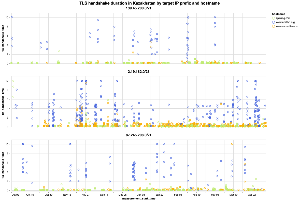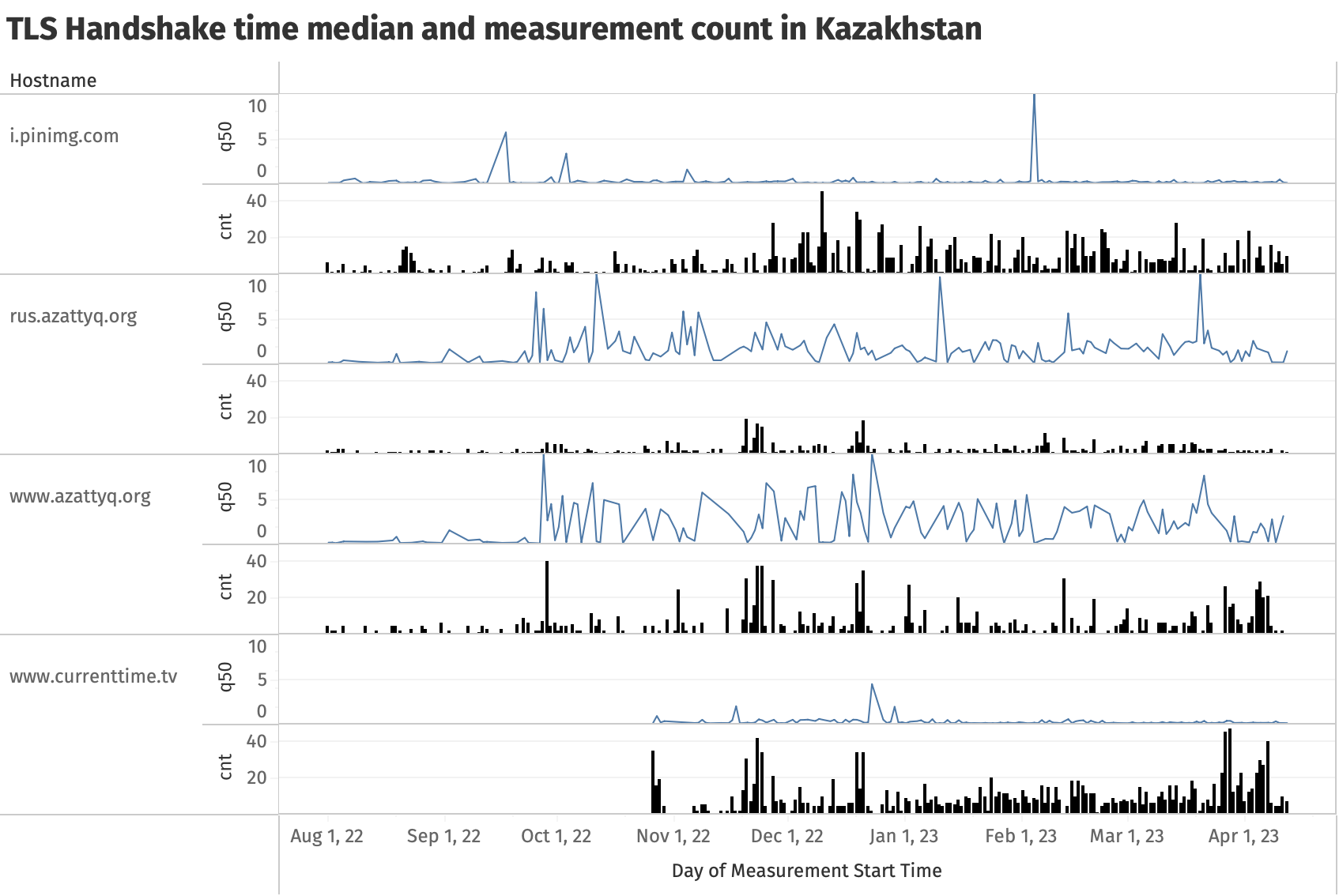In the above chart, we observe that ISPs in Kazakhstan block access to protonvpn.com and centralasia.media by timing out the entire TLS handshake. But in the cases of www.azattyq.org, rus.azattyq.org and www.currenttime.tv , the TLS handshakes are usually successful (which is why those measurements are annotated as “ok” in the chart), but with significant delays.