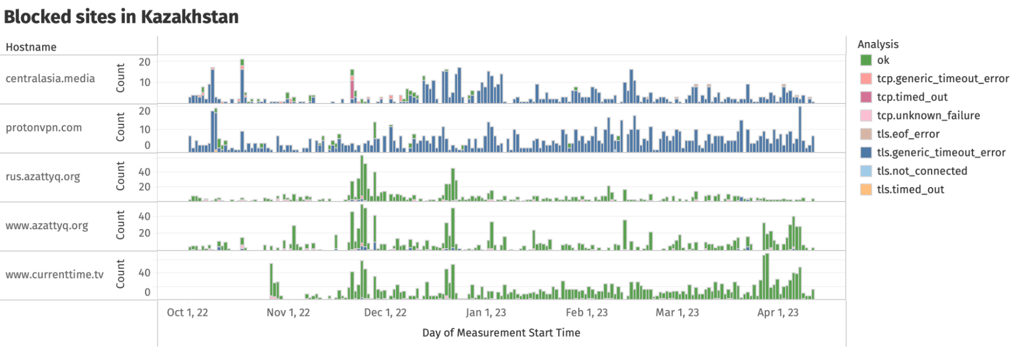 - Ongoing throttling of Radio Free Europe/Radio Liberty (RFE/RL) service websites. OONI data suggests that access to www.azattyq.org and rus.azattyq.org has been throttled in Kazakhstan since 27th September 2022. As of 11th April 2023, the testing of the domains still shows signs of throttling.