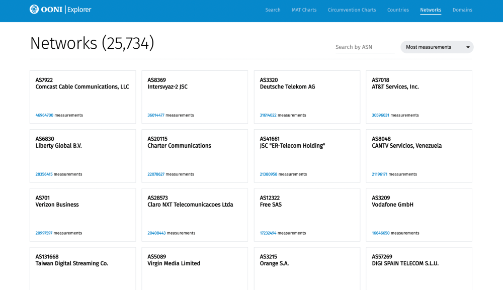 Censorship often varies from network to network, and it’s worth gaining insight into how internet censorship is implemented on each network. We therefore created new network-specific pages on OONI Explorer which enable you to learn about all OONI Probe testing on a specific ASN. Over the past decade, OONI Probe users globally have run tests on more than 26,000 networks, and you can find dedicated measurement pages for each of these networks.