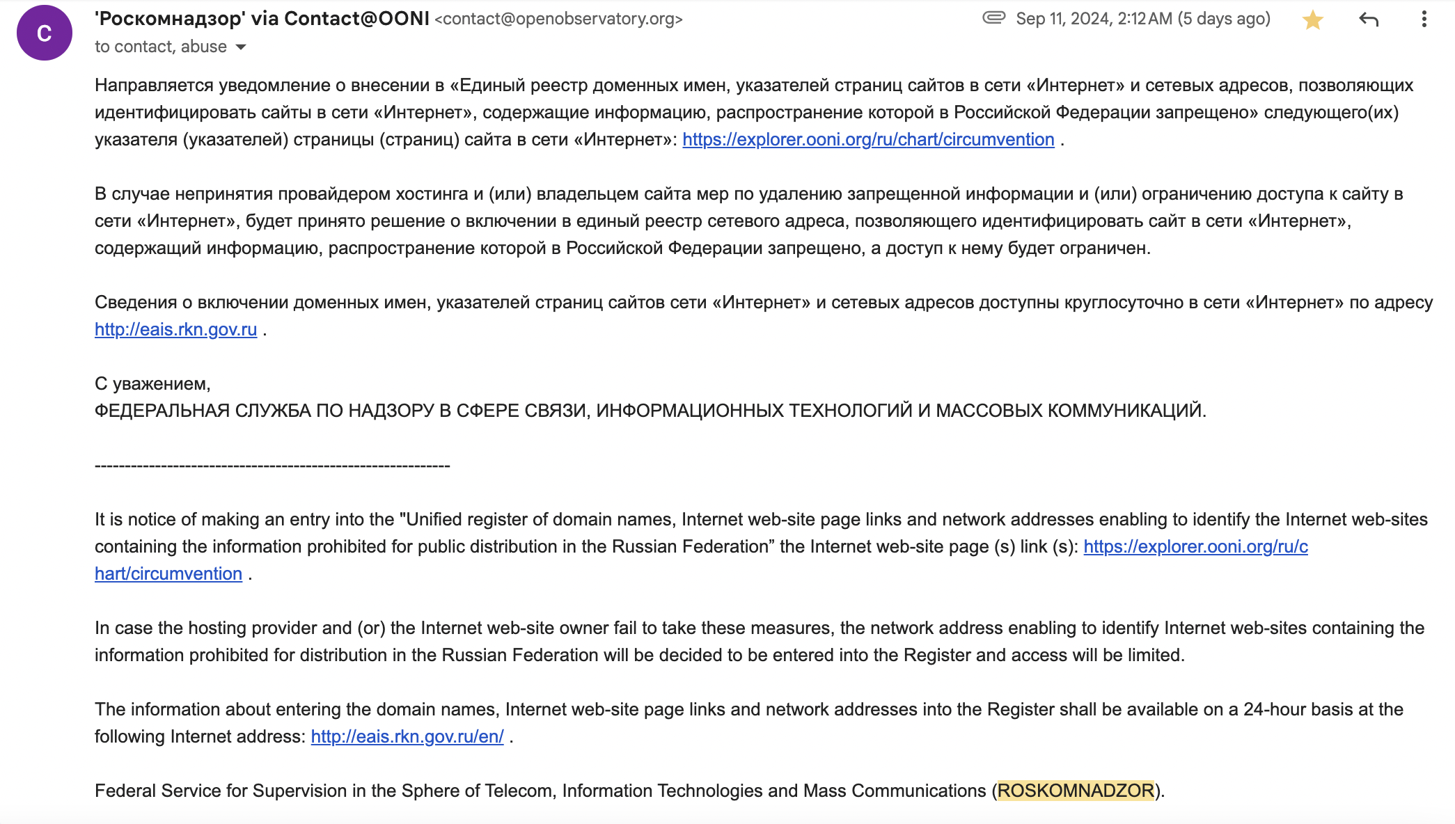 Image: Notice sent from Roskomnadzor to OONI regarding the entry of https://explorer.ooni.org/ru/chart/circumvention to Russia’s Unified Register.