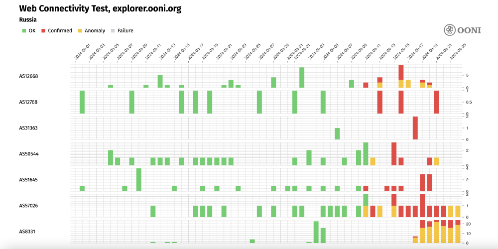 On 11th September 2024, we received an email from Roskomnadzor – Russia’s Federal Service for Supervision in the Sphere of Telecom, Information Technologies and Mass Communications – informing us of their decision to add https://explorer.ooni.org/ru/chart/circumvention to their blocking registry. On the same day, OONI data shows that multiple ISPs in Russia started blocking access to OONI Explorer.
