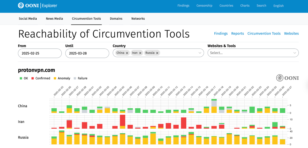 We chose those specific circumvention tool domains based on factors that include global relevance/use, global OONI measurement coverage, and whether they have been blocked (or are likely to get blocked). We refrained from including charts for all tested circumvention tool domains in the new Circumvention Tools page to enable usability. If you are interested in viewing OONI data for other circumvention tool websites that are not listed on the Circumvention Tools page, you can do so through the OONI Explorer Search Tool or Measurement Aggregation Toolkit (MAT).