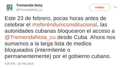 But a few hours before the referendum, independent news outlet Tremenda Nota reported that their website got blocked in Cuba.