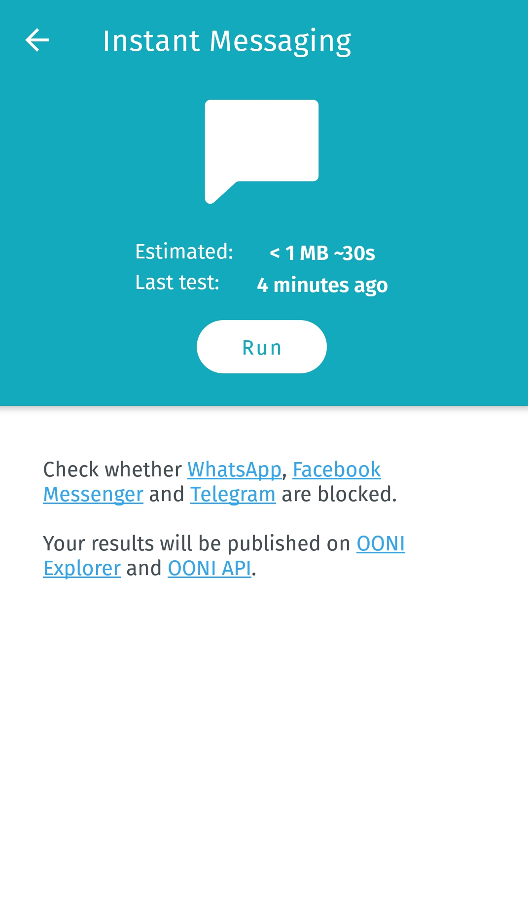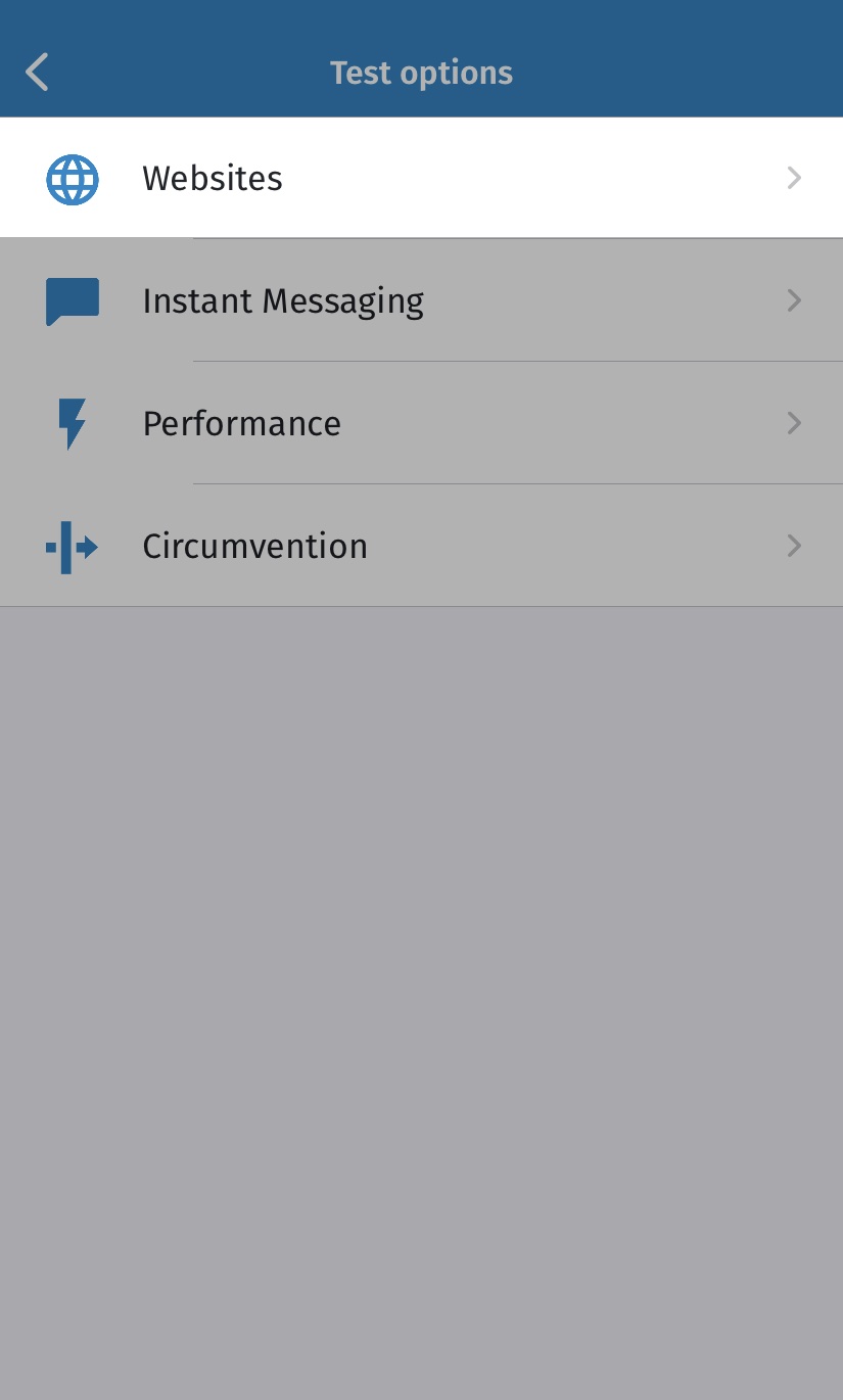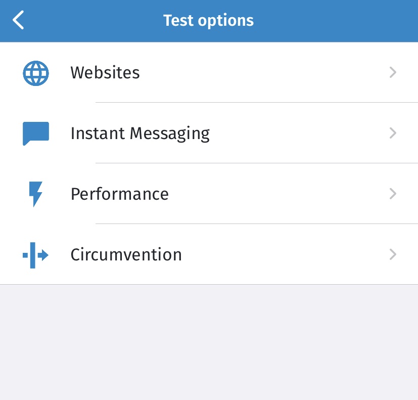 - Мессенджеры. Включает тесты OONI WhatsApp, Facebook Messenger, Telegram и Signal, которые проверяют блокировку приложений.