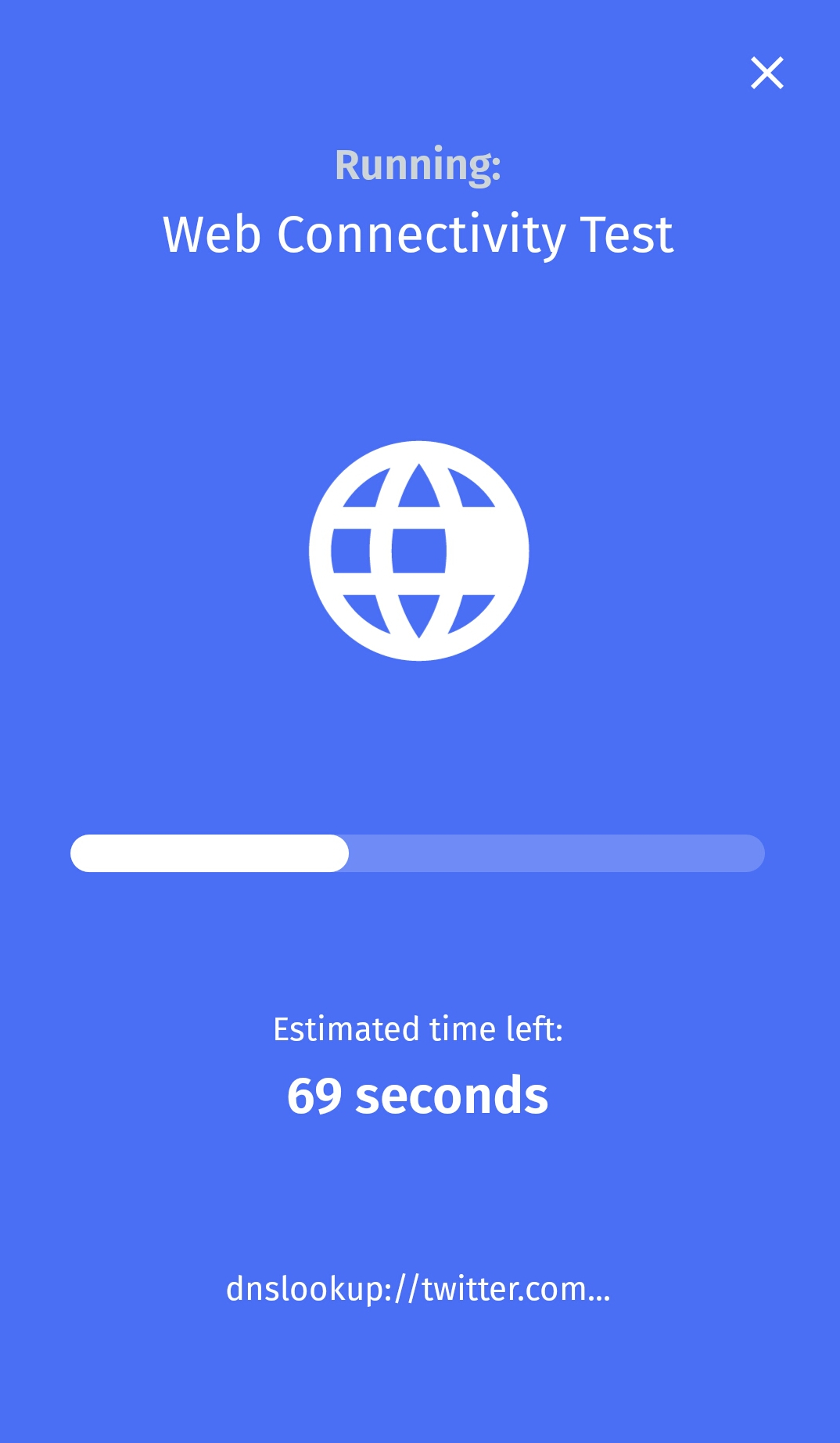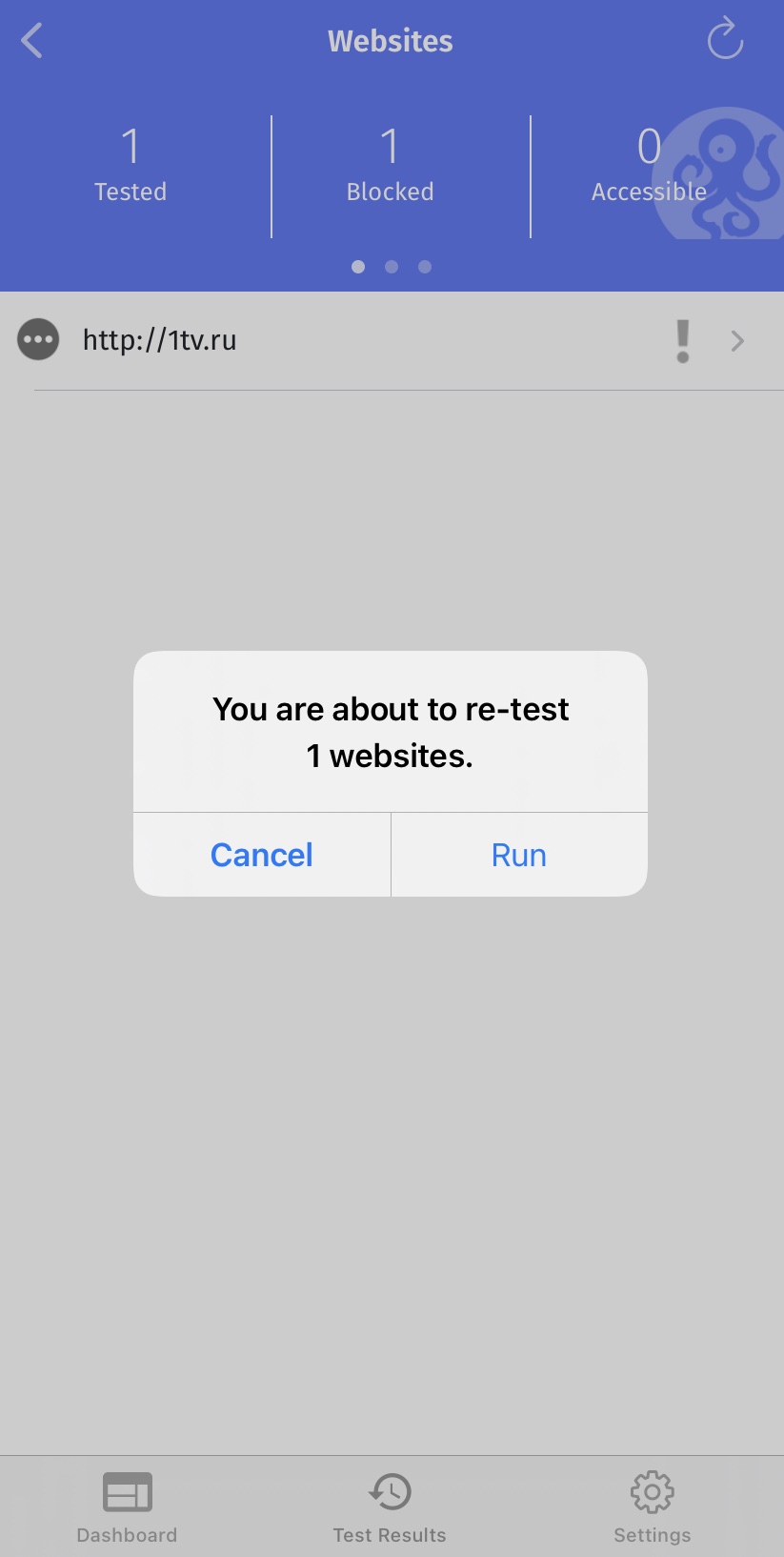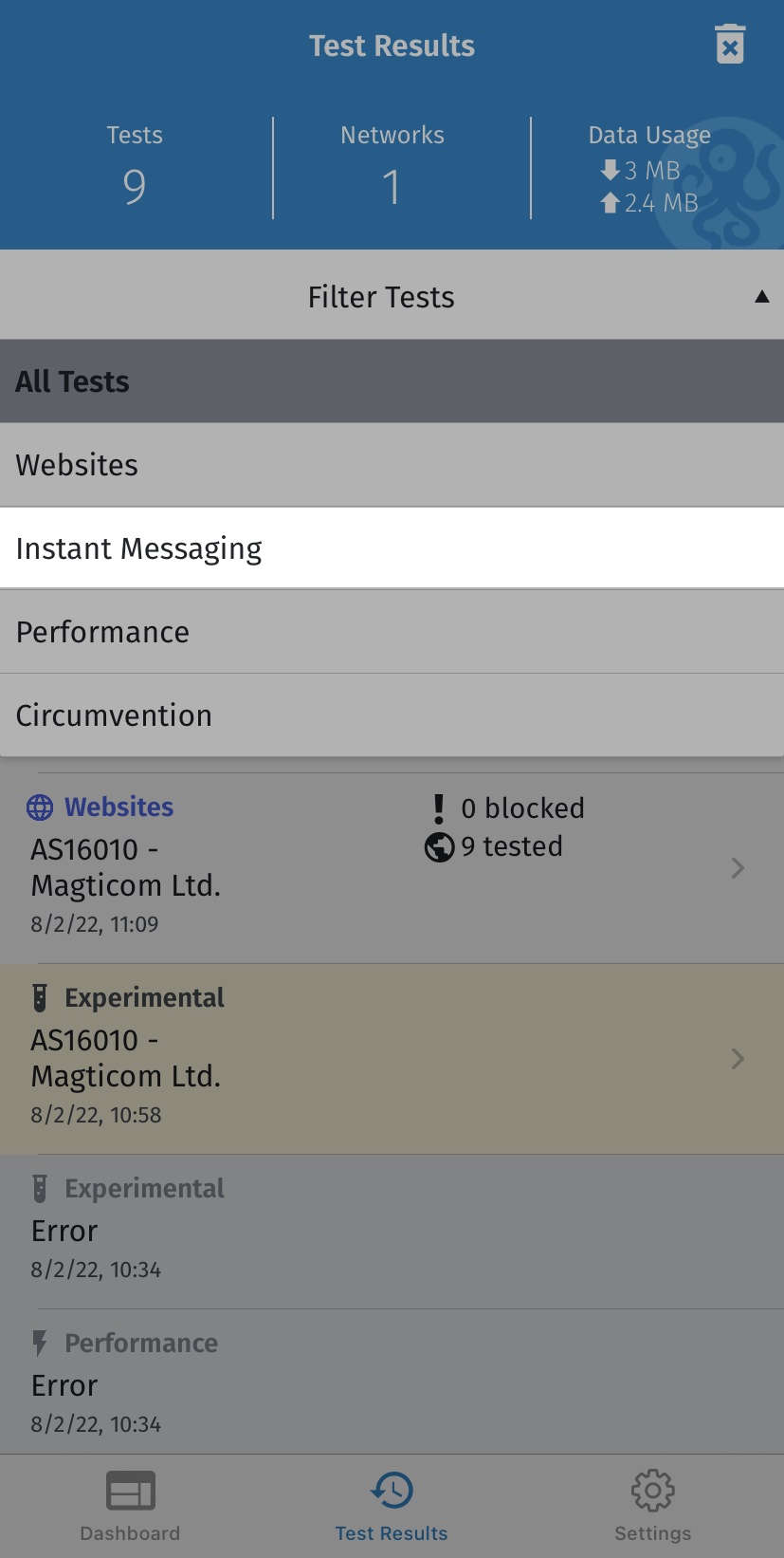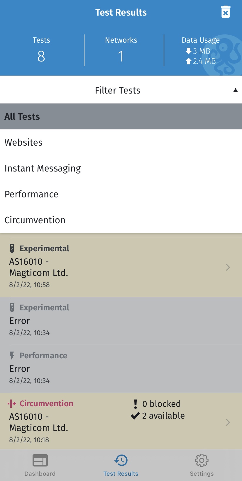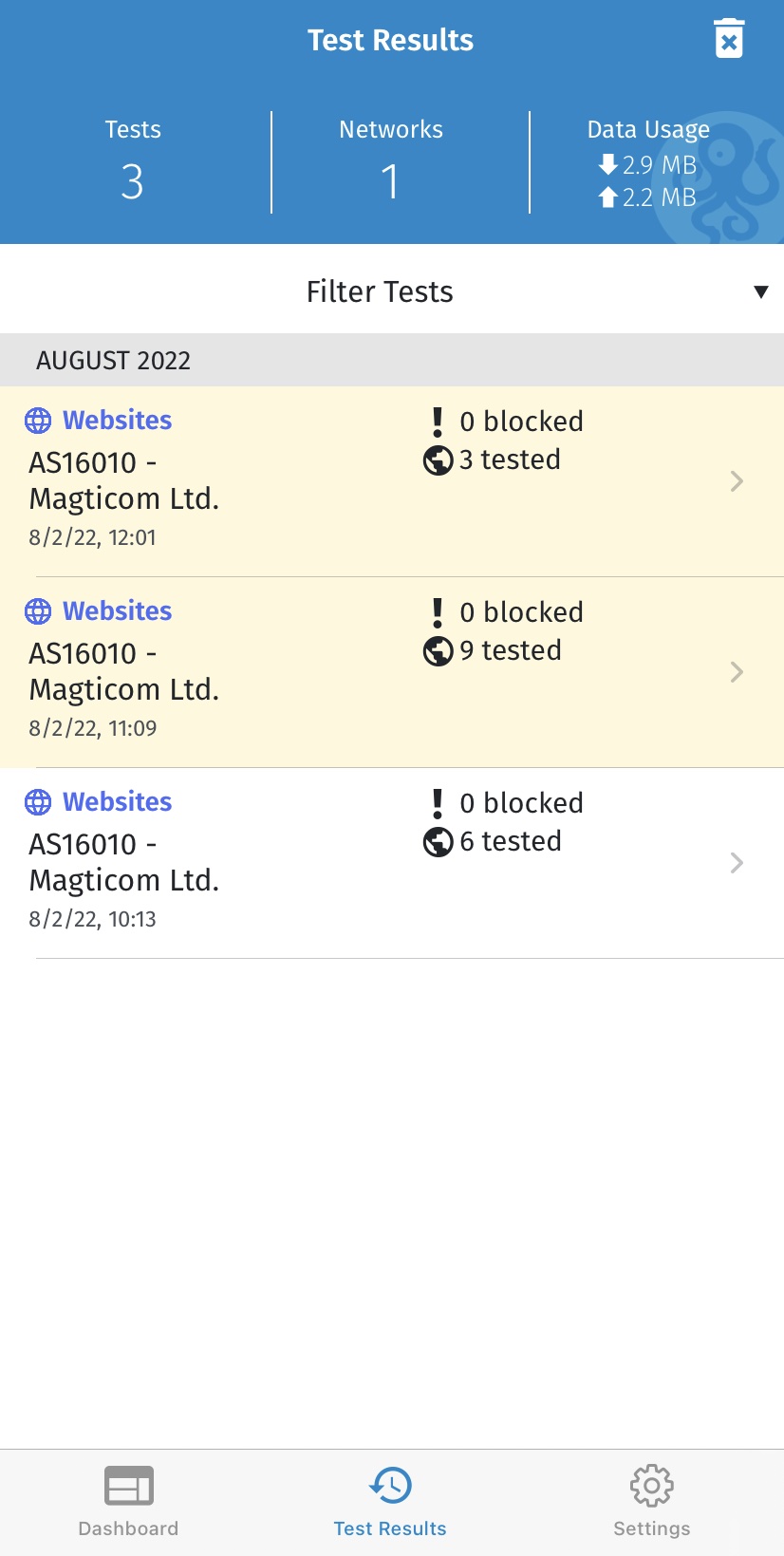 OONI Probe должен выполнить все тесты в течение нескольких минут (зависит от скорости сети, к которой вы подключены, в некоторых случаях это может занять больше времени). Если скорость вашей сети недостаточна и тесты занимают слишком много времени, вы можете остановить текущий тест, нажав на Остановить тест .