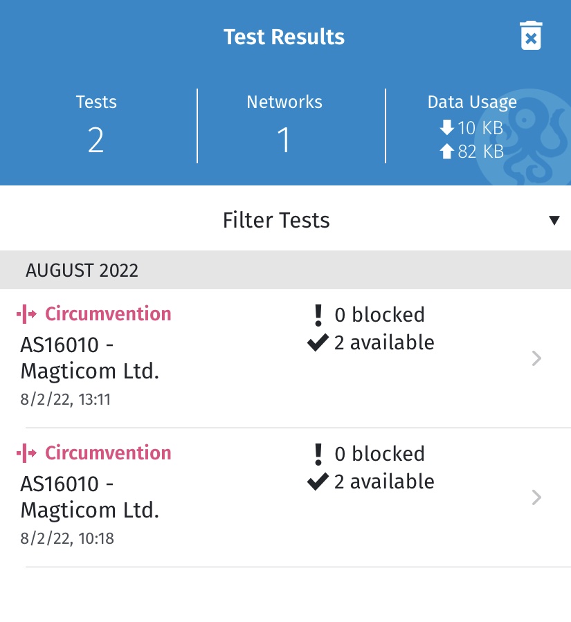 Все результаты тестов OONI Probe были удалены из вашего приложения.