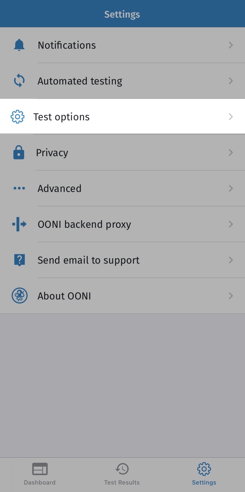 Шаг 1. Нажмите Варианты тестирования в разделе настроек вашего приложения OONI Probe.