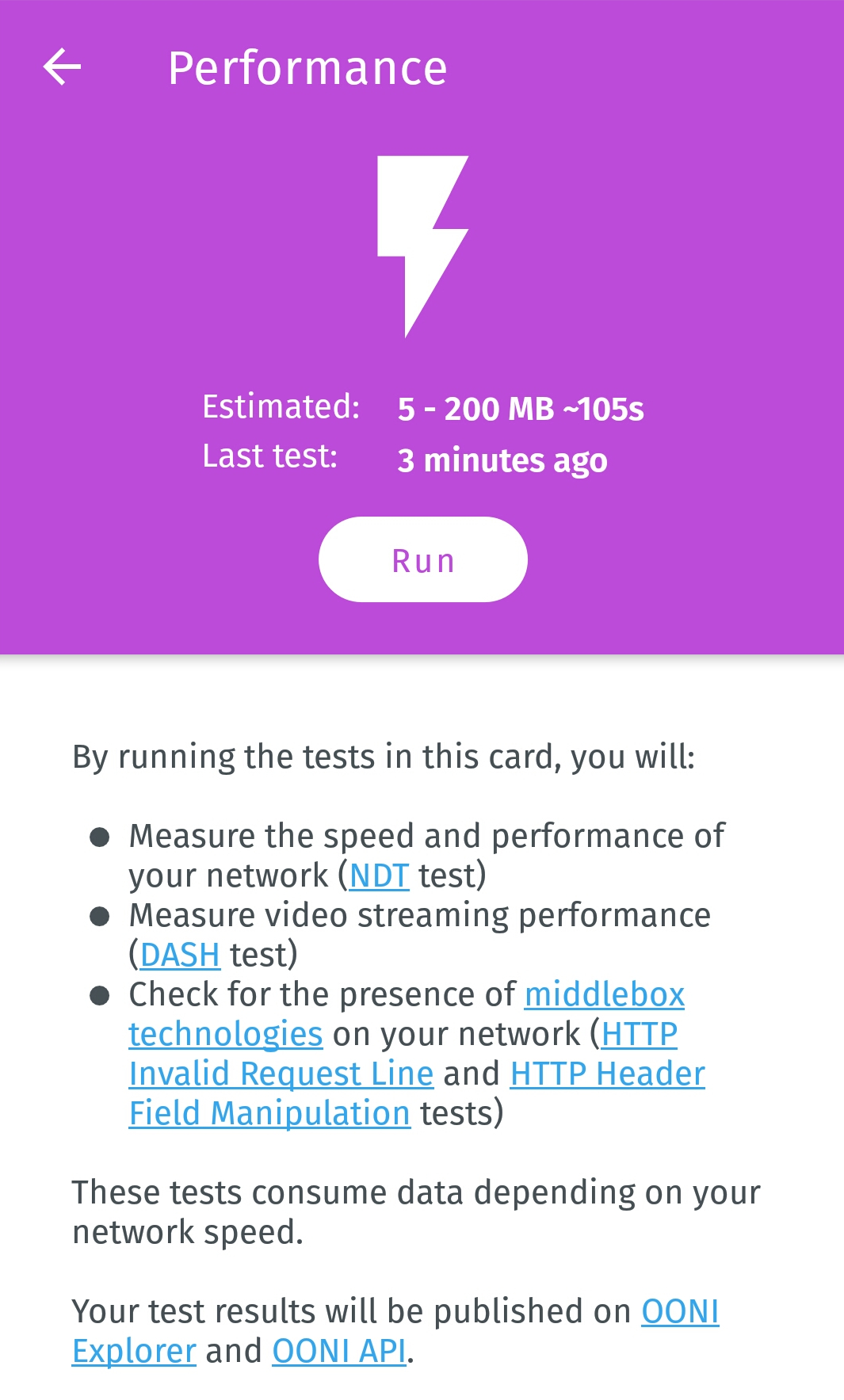 - Производительности. Включает тест скорости NDT, тест производительности видео-стриминга DASH, и OONI middlebox тесты (HTTP Header Field Manipulation тест и HTTP Invalid Request Line).
