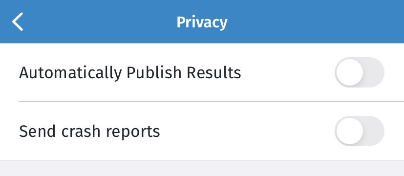 По умолчанию результаты тестов OONI Probe публикуются автоматически, а отправка отчетов об ошибках будет включена только если вы согласились на это во время первого входа в приложение.