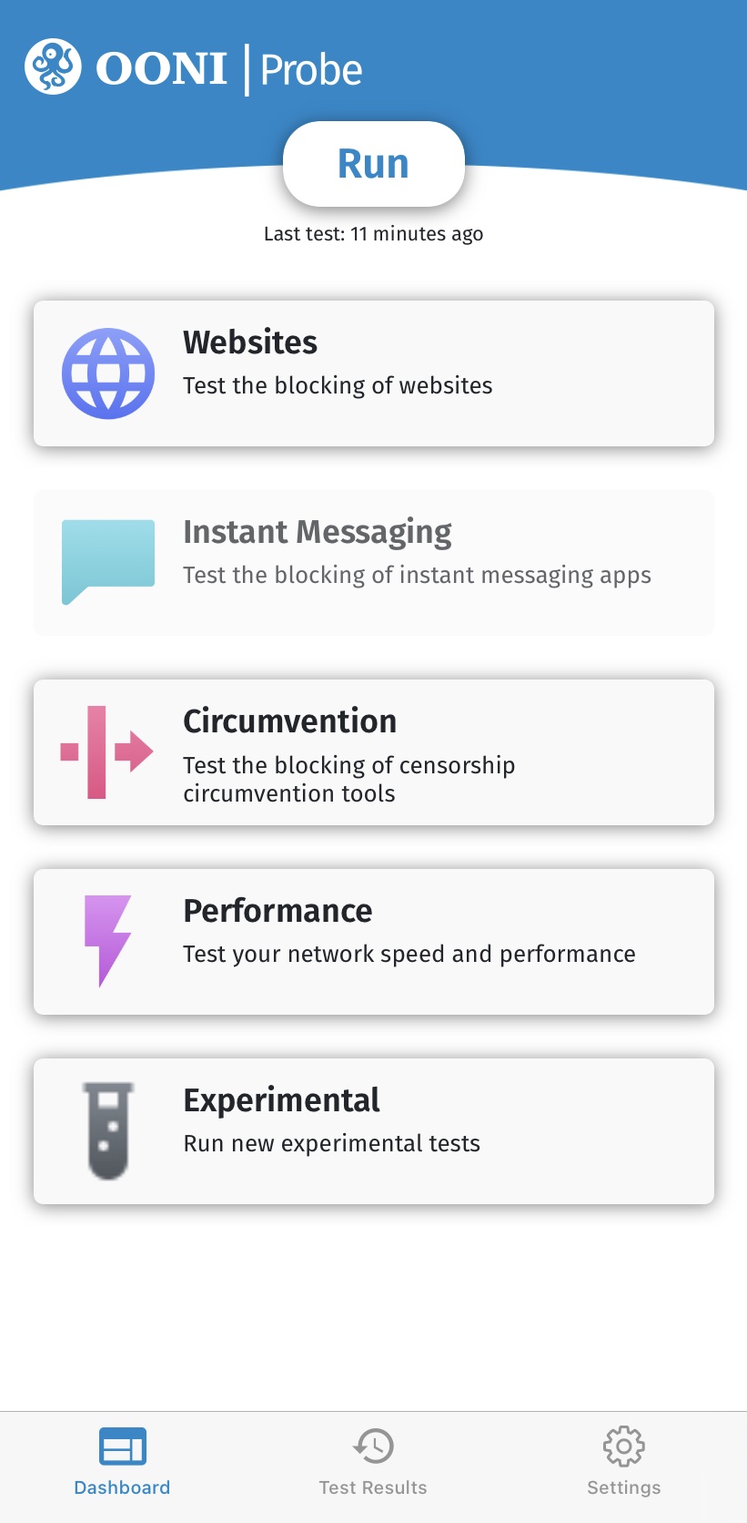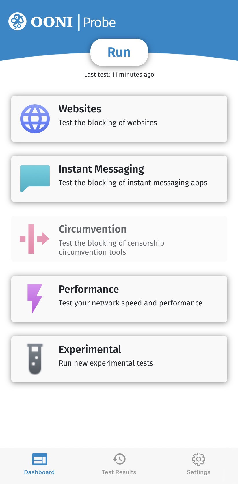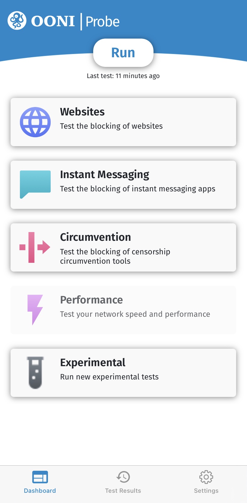 Главное меню OONI Probe включает 5 карточек, каждая из которых содержит тесты OONI Probe: