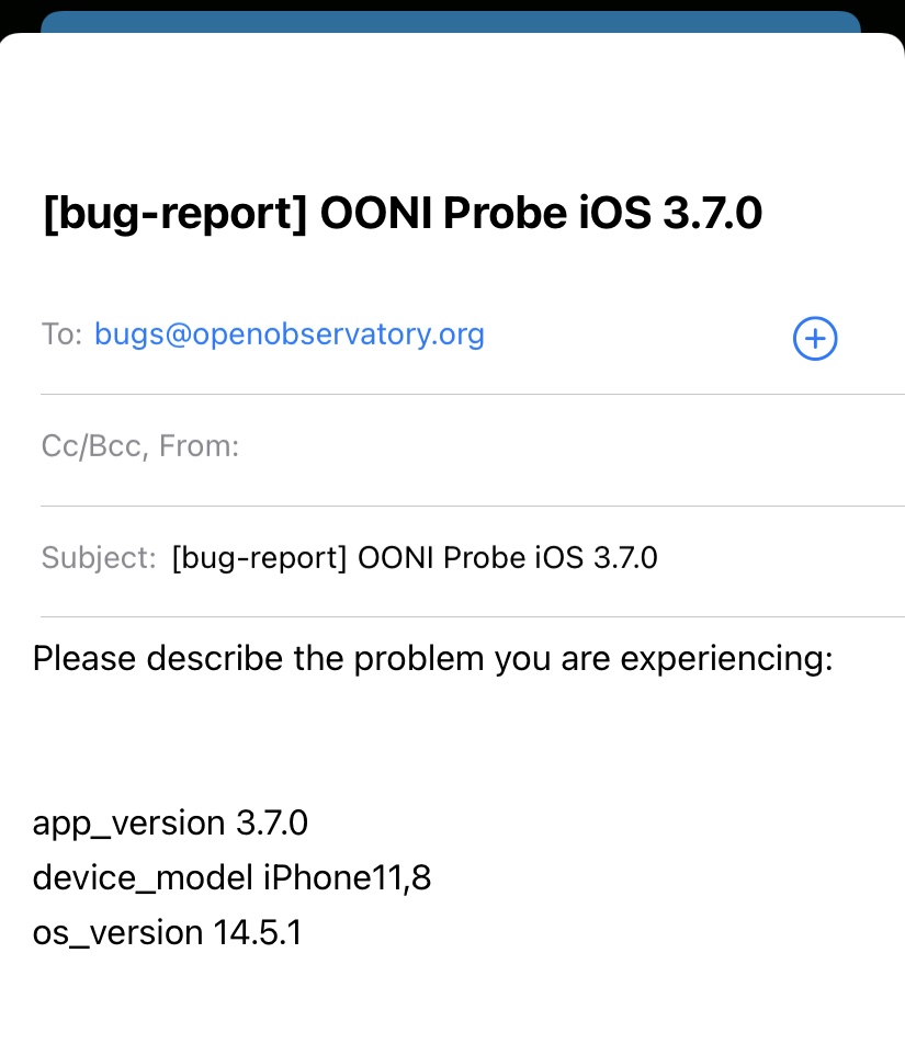 Шаг 2. Напишите письмо с описанием проблем, с которыми вы столкнулись при использовании OONI Probe. В зависимости от проблемы может быть полезно поделиться с нами логами и/или необработанными данными измерений (как описано в разделе «Поделиться результатами ваших тестов OONI Probe» этой инструкции).