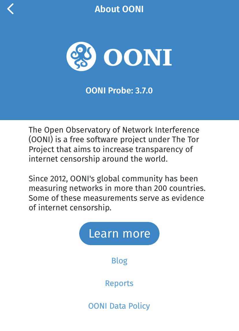Последняя настройка «Об OONI» приложения OONI Probe содержит информацию об OONI и версию программного обеспечения OONI Probe, которую вы используете в данный момент.